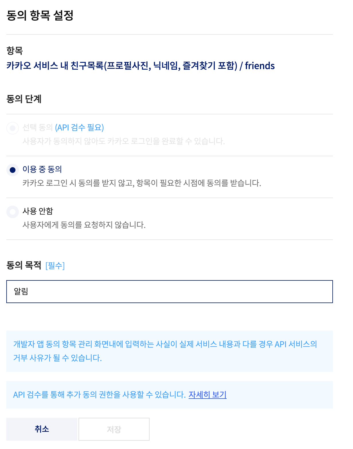`카카오 서비스 내 친구목록(프로필사진, 닉네임, 즐겨찾기 포함)`와 `카카오톡 메시지 전송`을 이용 중 동의로 설정한다.