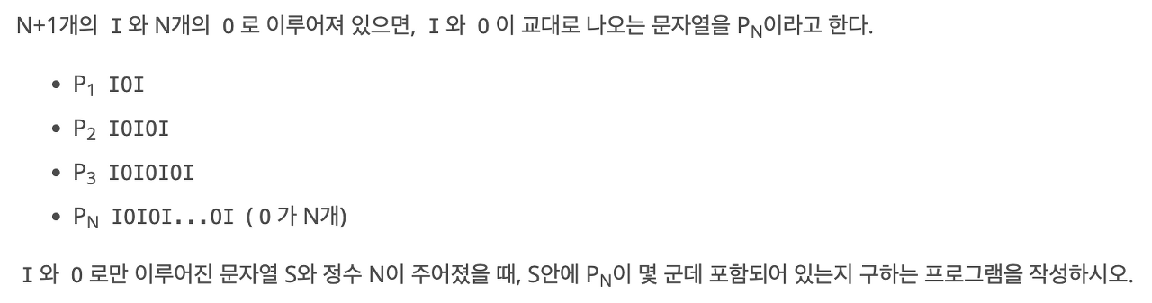 N+1개의 I와 N개의 O로 이루어져 있으면, I와 O이 교대로 나오는 문자열을 PN이라고 한다. P1 IOI P2 IOIOI P3 IOIOIOI PN IOIOI...OI (O가 N개) I와 O로만 이루어진 문자열 S와 정수 N이 주어졌을 때, S안에 PN이 몇